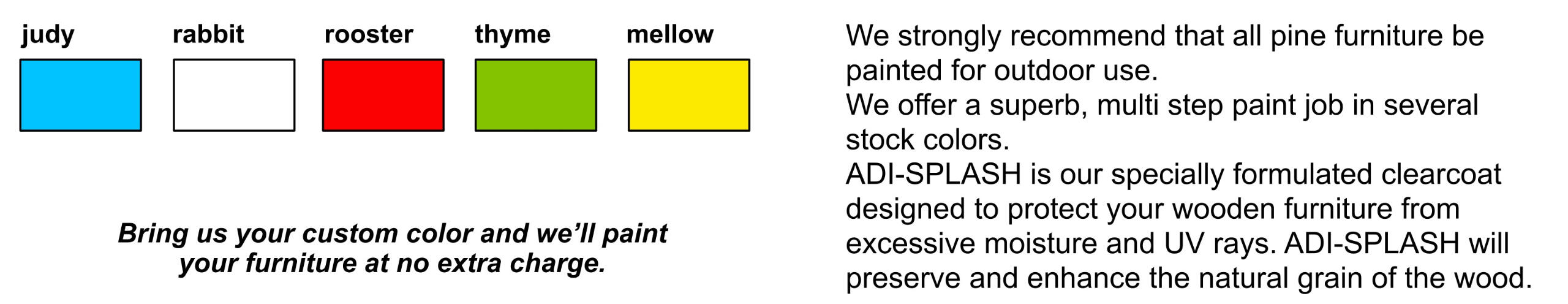 mahogany is second to none for durability in outdoor furniture. This tropical hardwood is completely rot resistant and requires no maintenance whatsoever. Mahogany will weather to a silvery gray if left unfinished. If you don’t find this look appealing, you can choose our adi-splash or apply a semi transparent stain after it has weathered.