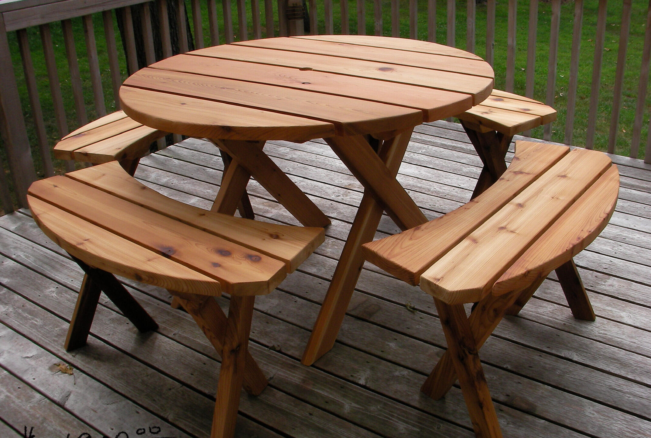 For a casual outdoor dining experience, our 54” Round picnic table is the perfect choice. Seating for 8 with detached benches. Thick cedar or pine construction.