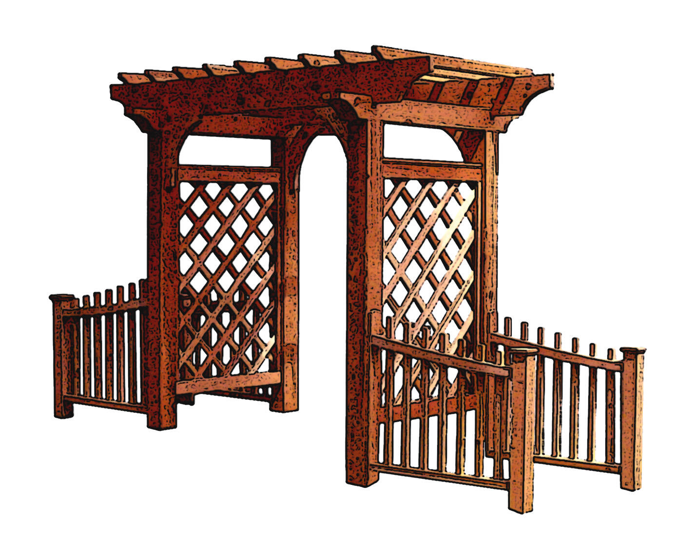 Just one example of the many styles available at Woodstock. We are happy to work with you in the design of your arbor so that it fits perfectly into your setting. Made of cedar and or pressure treated lumber. Custom does not necessarily mean expensive. Call us with your dimensions and we can provide a quote.
