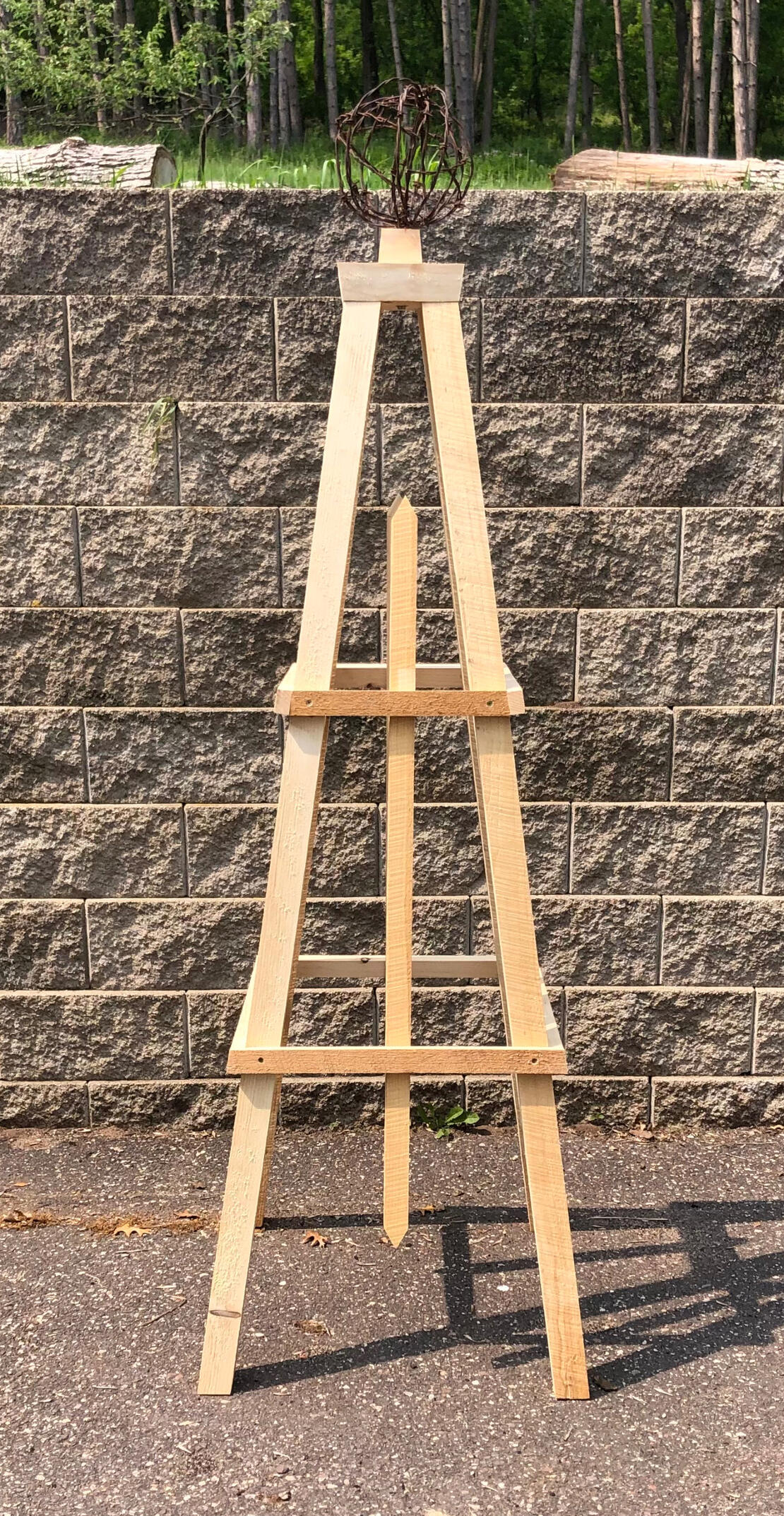 7’ tall and built with chunky pine from our sawmill. Let your flowering vines or green beans climb on our obelisk trellis. Add your touch of creative design with a unique finial at the top. This one has a rusty barbed wire ball.