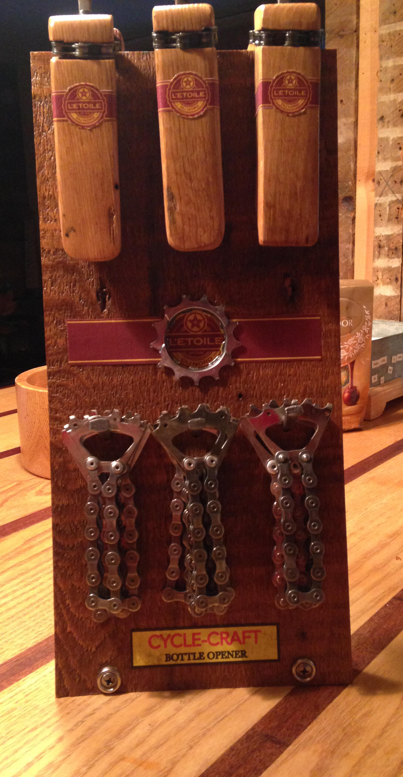 Bottle openers crafted from barrel staves and bike parts. Makes for a great keychain and conversation piece. They also make great Christmas ornaments.
