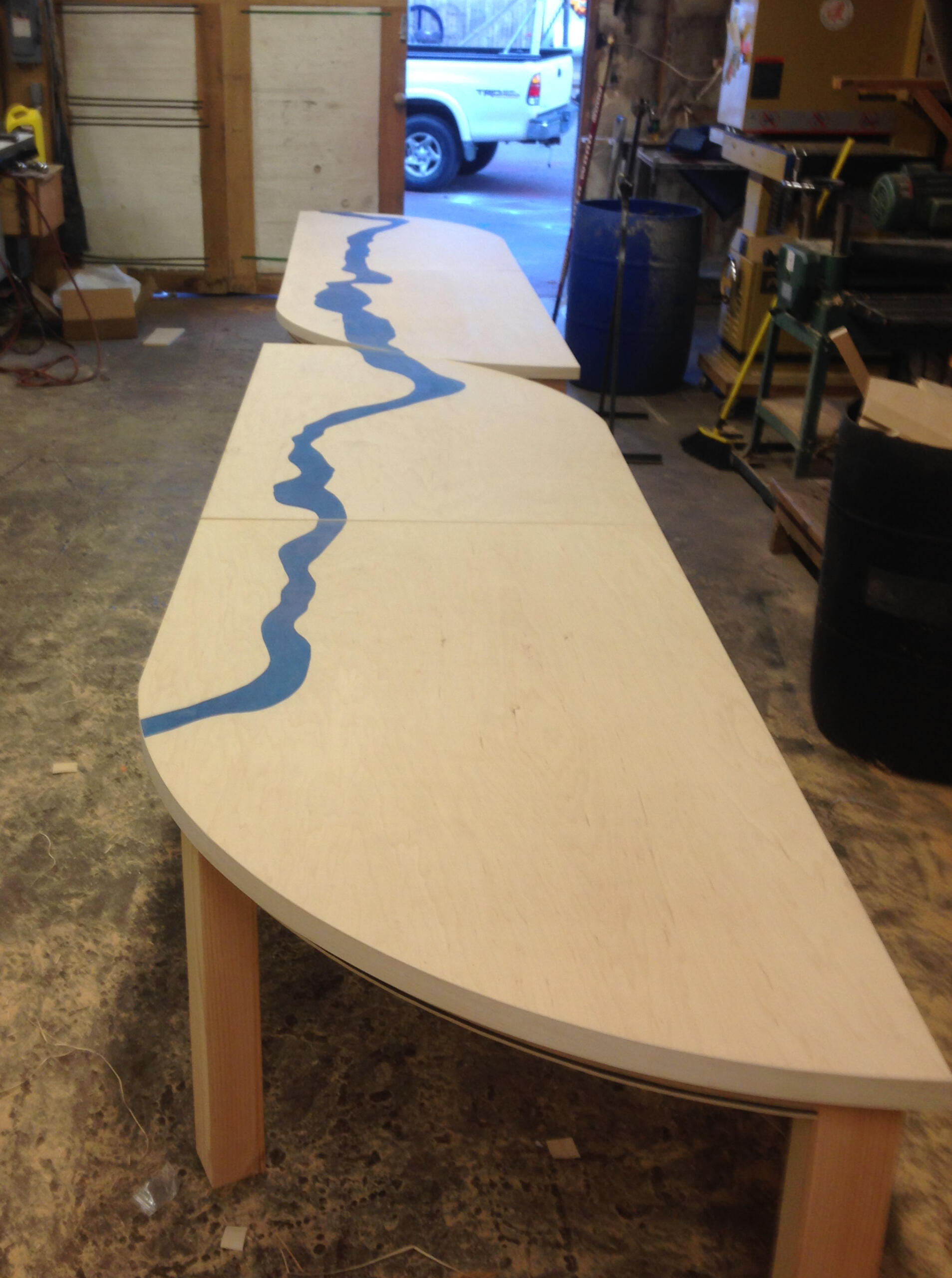 A series of tables that serve as a large conference grouping that can be separated and configured to suit a variety of needs. Tabletop puzzle is the st. Croix river map from marine on st. Croix to the Mississippi.