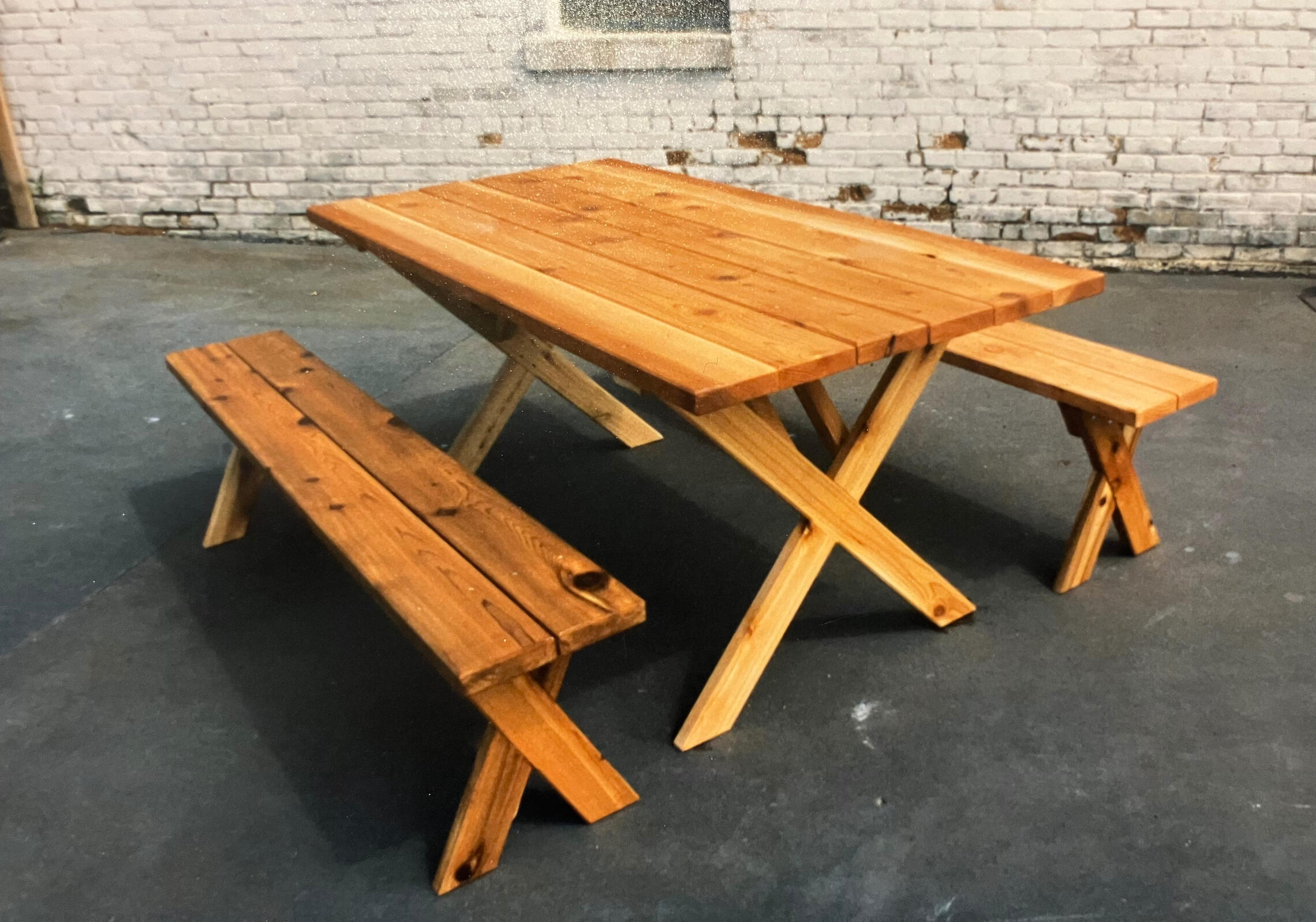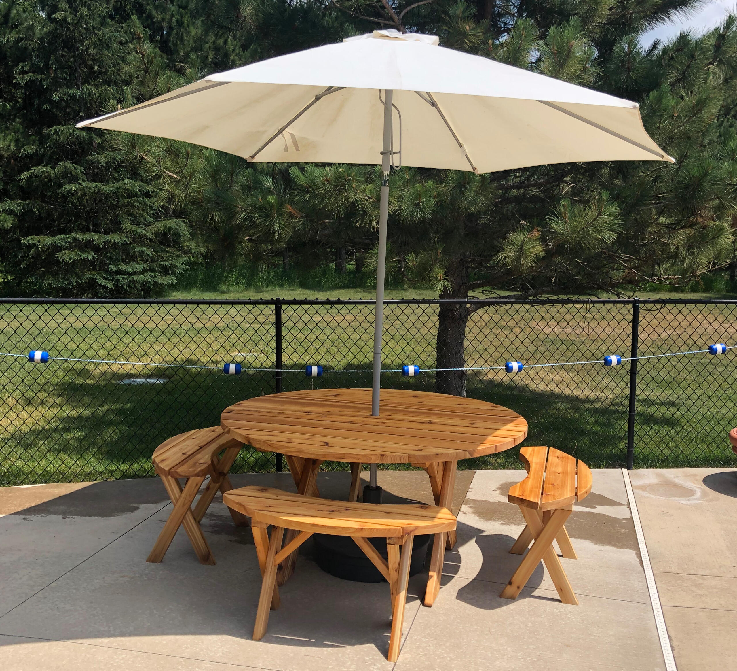 For a casual outdoor dining experience, our 54” Round picnic table is the perfect choice. Seating for 8 with detached benches. Thick cedar or pine construction.